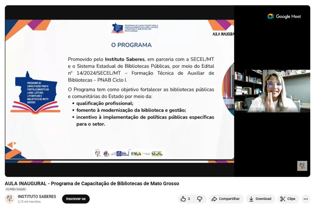 A iniciativa é realizada pelo Instituto Saberes, em parceria com a Secretaria de Estado de Cultura, Esporte e Lazer (Secel/MT) e com o Sistema Estadual, a partir da seleção no Edital nº 14/2024 – Formação Técnica de Auxiliar de Bibliotecas, no âmbito da Política Nacional Aldir Blanc de Fomento à Cultura (PNAB Ciclo I), com recursos do Ministério da Cultura / Governo Federal.