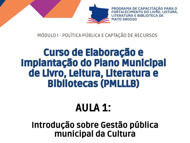 Começou, nessa terça-feira (11), o Curso 2 do Programa de Capacitação para o Fortalecimento do Livro, Leitura, Literatura e Biblioteca de Mato Grosso, cujo tema é Elaboração e Implantação do Plano Municipal de Livro, Leitura, Literatura e Bibliotecas (PMLLLB). A primeira aula falou sobre “Introdução sobre gestão pública municipal da Cultura”, foi conduzida pelo consultor pedagógico Adriano Souza e contou com duas horas de conteúdo ministrado remotamente e ao vivo.