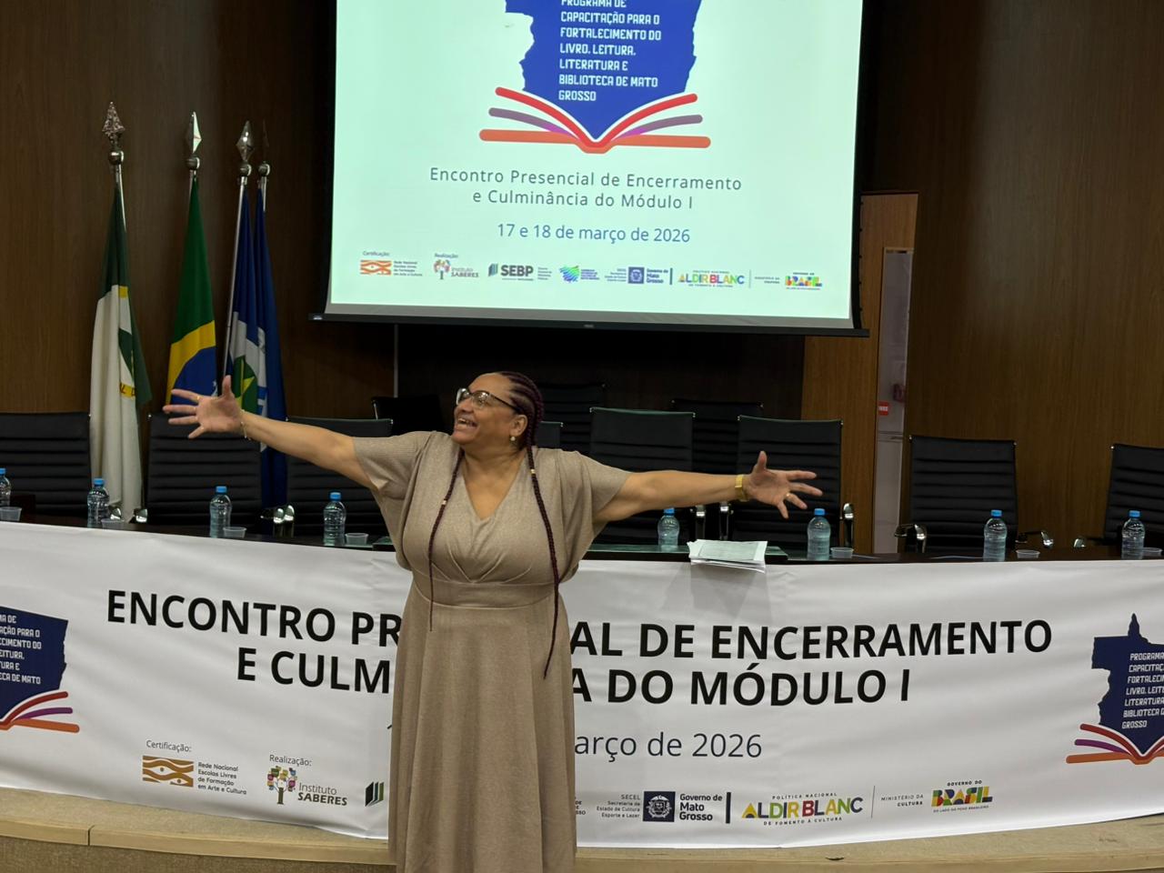 A cerimônia de abertura do Encontro Presencial de Encerramento do Primeiro Módulo do Programa de Capacitação para o Fortalecimento do Livro, Leitura, Literatura e Biblioteca de Mato Grosso, na tarde desta terça-feira (17), foi marcada por um momento de grande emoção e sensibilidade artística. A escritora e poeta Luciene Carvalho, presidente da Academia Mato-Grossense de Letras, protagonizou uma performance sobre ser mulher negra e tantas profundidades que a atravessa. E foi assim que o evento foi oficialmente aberto, com fortes aplausos.