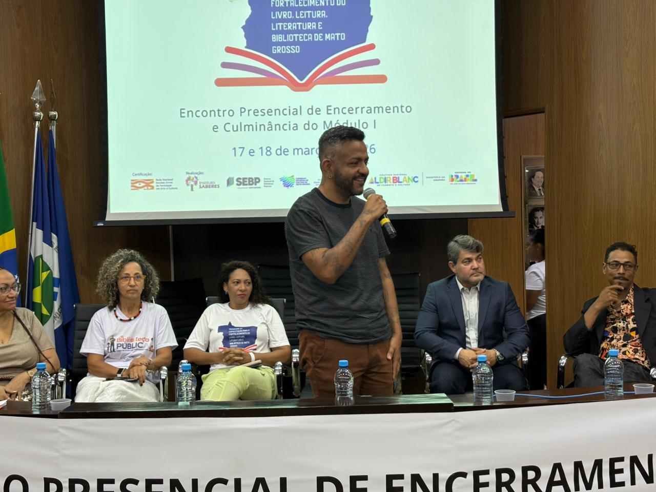 Em sua fala, Jan Moura, secretário adjunto de Cultura de Mato Grosso, registrou que é gestor cultural criado em bibliotecas. “Eu tenho certeza que, em algum momento, o livro, a leitura atravessou minha vida”. Agradeceu também a presença dos gestores municipais e asseverou: “Quem realmente entrega a política pública lá na ponta são vocês”.